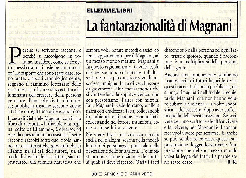 Review by Giuseppe Marchetti, critico letterario Gazzetta di Parma - Qui Parma - Supplemento Gazzetta di Parma, Settember 1988.